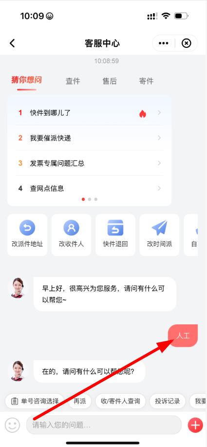 3、進入在線客服對話界面后,在輸入框輸入人工,按提示操作即可轉(zhuǎn)接人工客服。