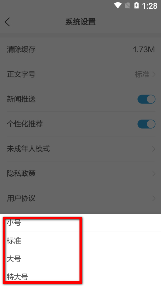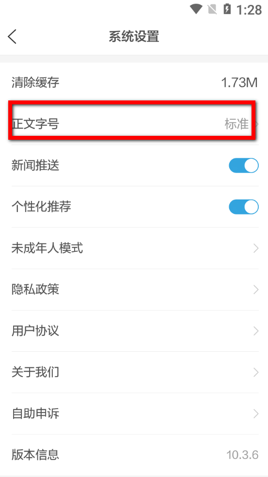 3、在系統(tǒng)設(shè)置頁面,點擊正文字號選項,彈出字號選擇框。