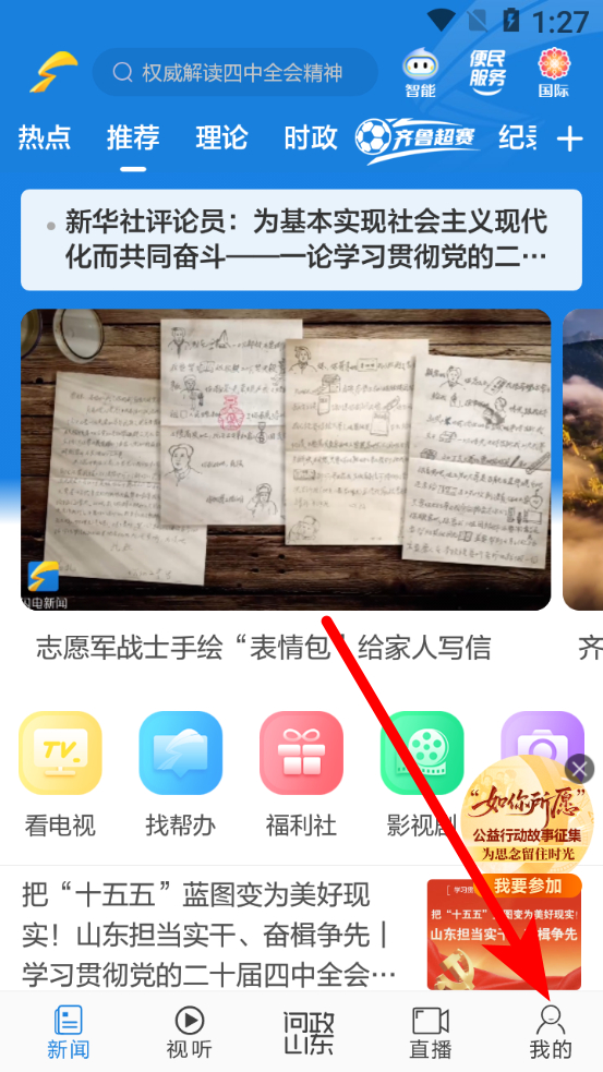 1、打開閃電新聞App,點擊底部導(dǎo)航欄中的問政山東選項。