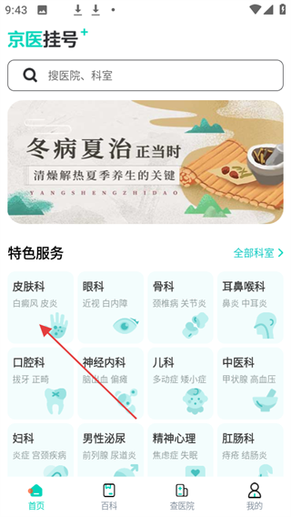 1、打開(kāi)北京醫(yī)院掛號(hào)通APP,在特色服務(wù)板塊中,點(diǎn)擊想要掛號(hào)的科室。