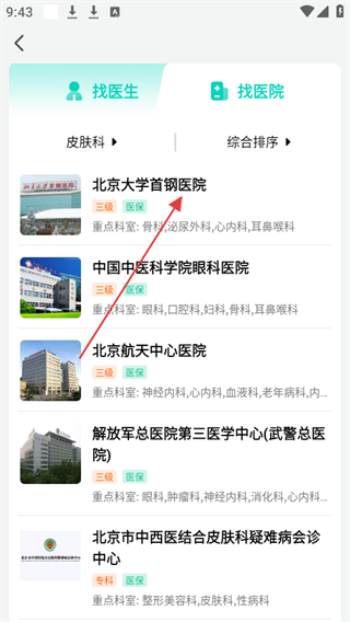 2、進(jìn)入科室頁(yè)面后,會(huì)顯示提供該科室服務(wù)的醫(yī)院列表,選擇一家想要就診的醫(yī)院。