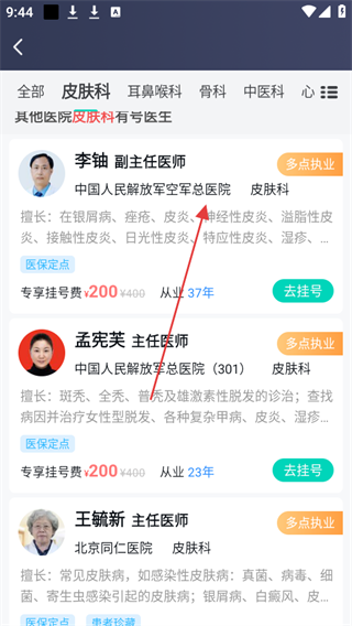 3、進(jìn)入所選醫(yī)院的科室醫(yī)生頁(yè)面,瀏覽醫(yī)生信息,選擇一位想要掛號(hào)的醫(yī)生。