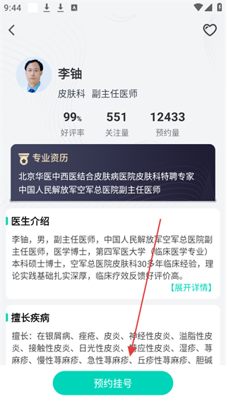 4、進(jìn)入醫(yī)生詳情頁(yè)面,查看醫(yī)生介紹及擅長(zhǎng)疾病等信息,點(diǎn)擊預(yù)約掛號(hào)。