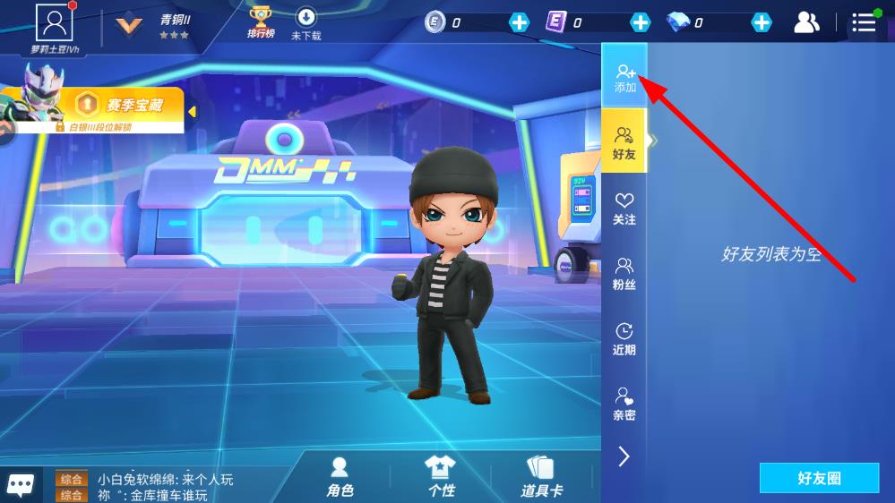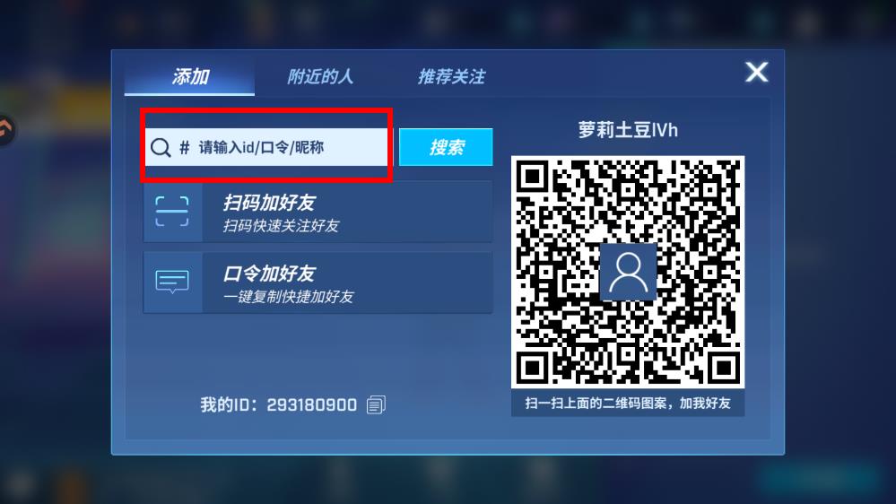 4、在添加好友界面,在輸入框中輸入對方id、口令或昵稱,點擊搜索,找到目標(biāo)好友后發(fā)送添加申請,來快速添加好友。