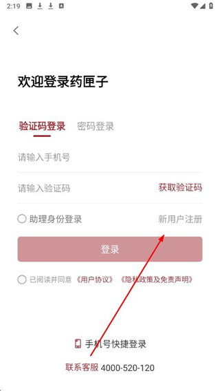 2、進(jìn)入登錄頁(yè)面后點(diǎn)擊新用戶注冊(cè)在注冊(cè)頁(yè)面,輸入姓名、手機(jī)號(hào),點(diǎn)擊“獲取驗(yàn)證碼”并填入短信驗(yàn)證碼,選擇所在地區(qū)和執(zhí)業(yè)機(jī)構(gòu)。