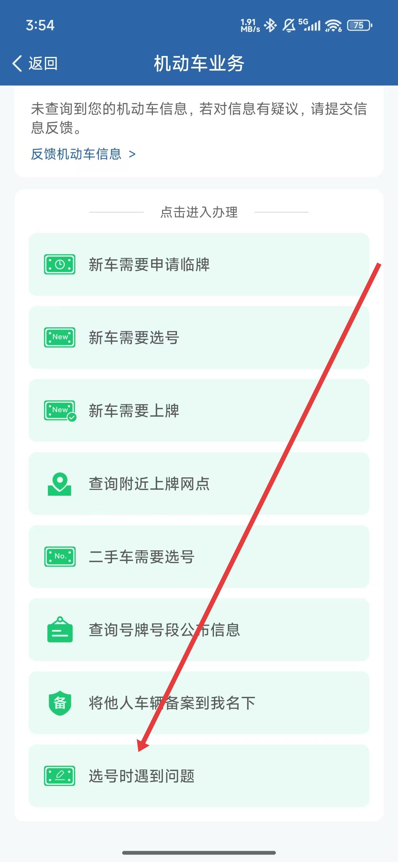 3、在機動車業(yè)務(wù)頁面中,點擊選號時遇到困難業(yè)務(wù)選項,進(jìn)入修改選號資料。