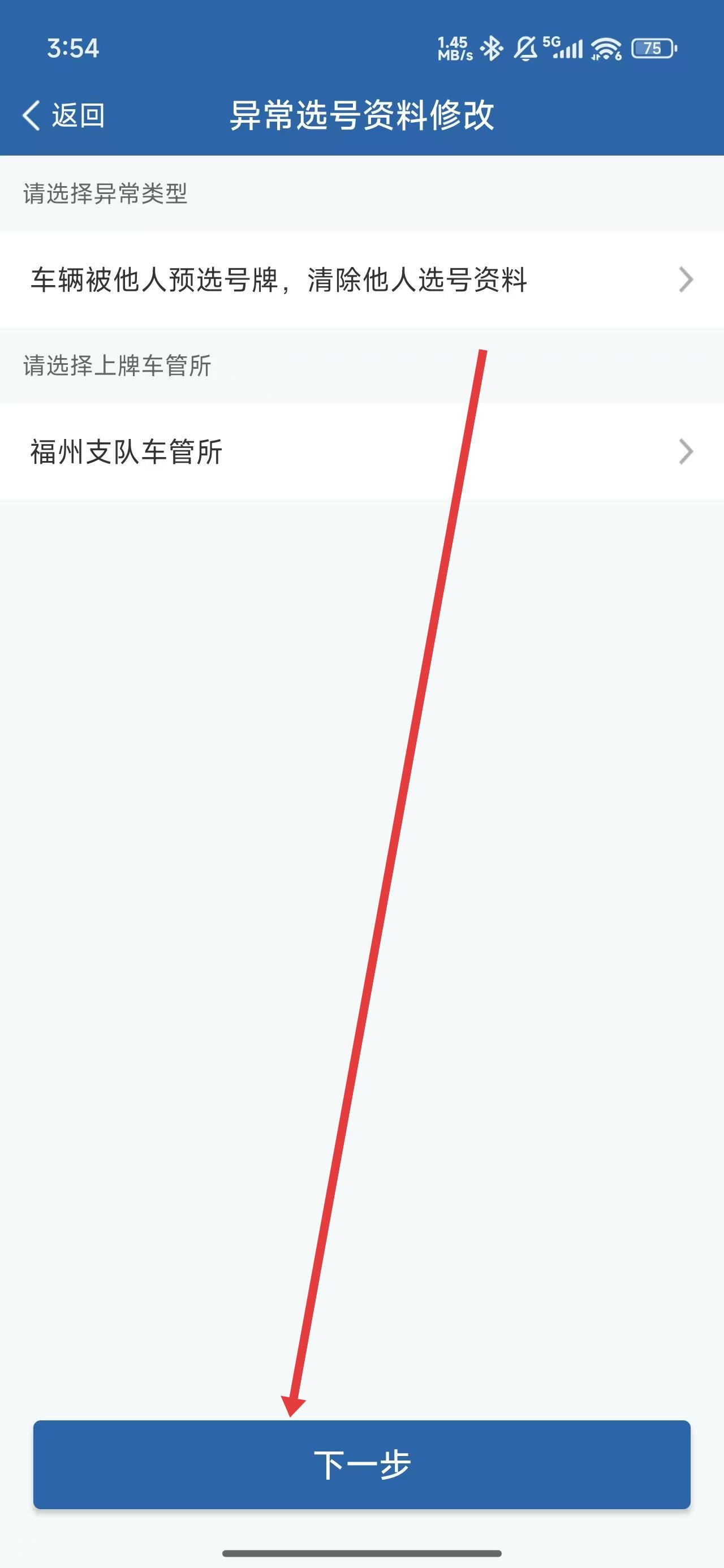 4、在異常選號資料修改頁面中,選擇完異常類型后,點擊下一步進(jìn)入后續(xù)修改操作。