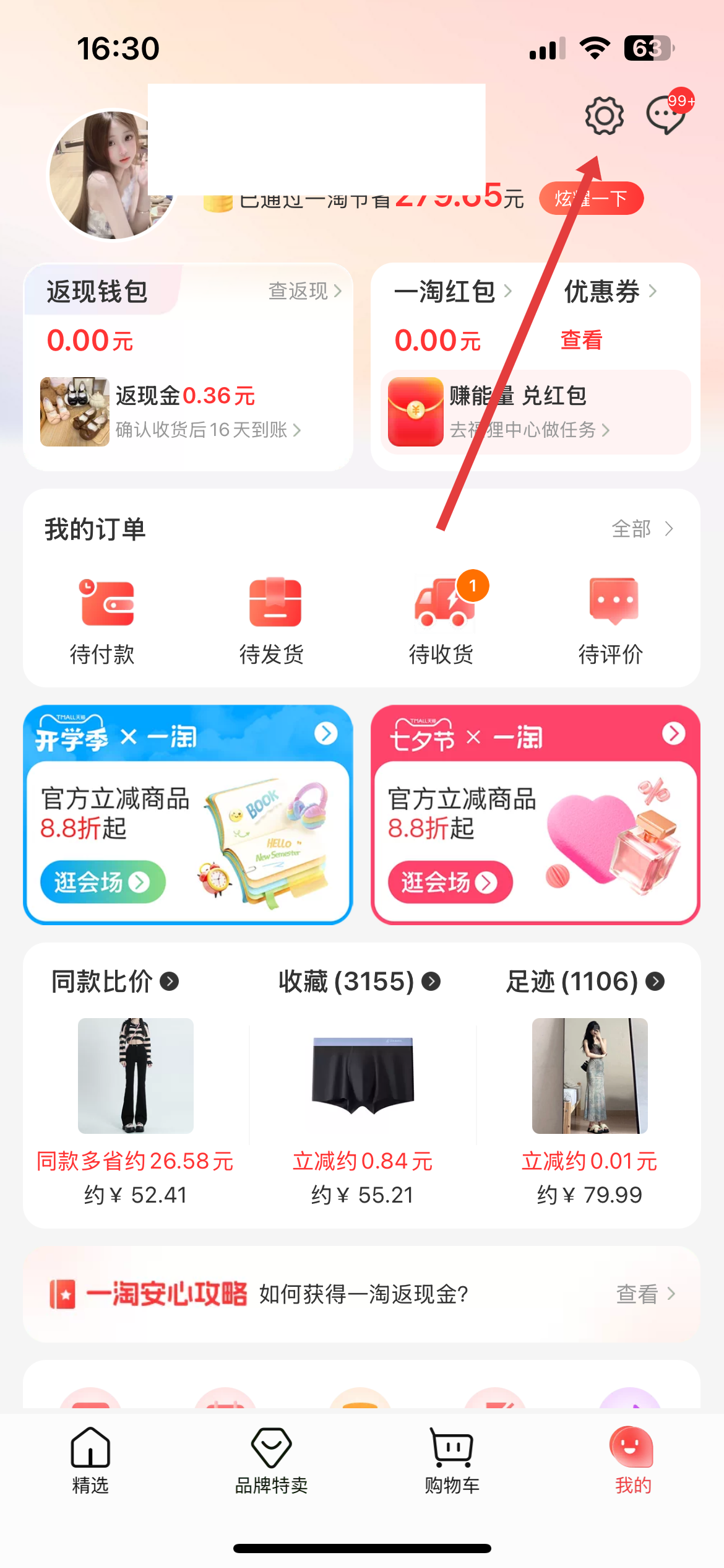 1、進(jìn)入一淘APP后,點(diǎn)擊底部導(dǎo)航欄中我的選項(xiàng),在頁(yè)面右上角找到設(shè)置,并點(diǎn)擊進(jìn)入設(shè)置頁(yè)面。