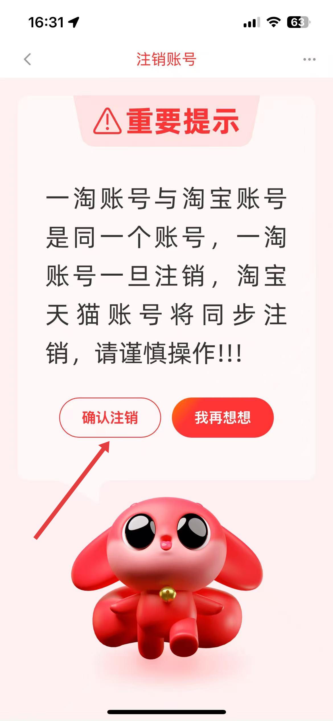 3、在注銷賬號(hào)頁(yè)面會(huì)看到重要提示,明確一淘賬號(hào)與淘寶天貓賬號(hào)關(guān)聯(lián)注銷的情況,若確定注銷點(diǎn)擊確認(rèn)注銷按鈕即可。