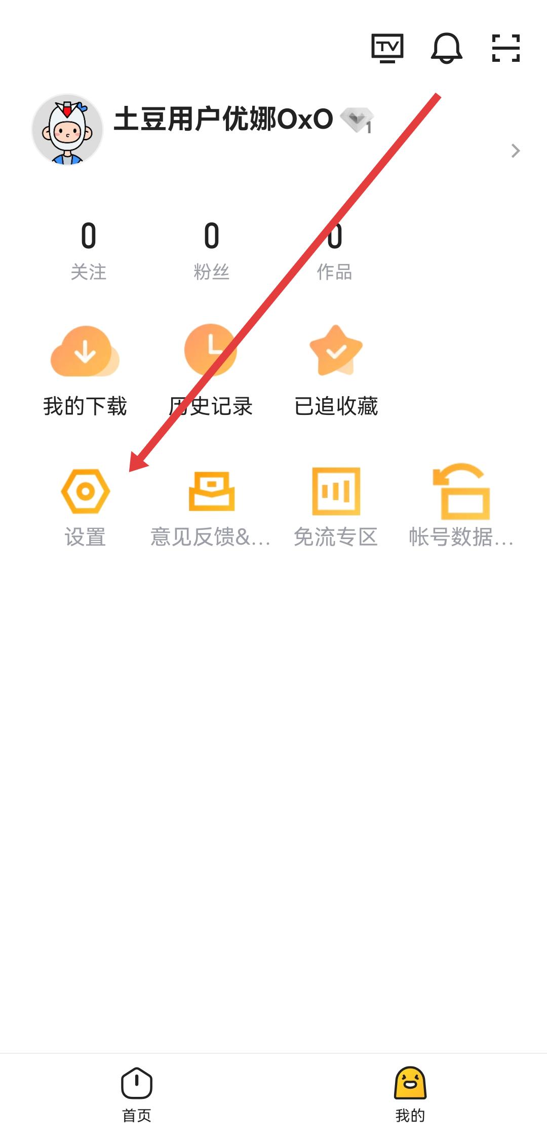 1、打開土豆視頻APP,進(jìn)入我的頁面后,點(diǎn)擊設(shè)置的圖標(biāo),進(jìn)入設(shè)置功能界面。