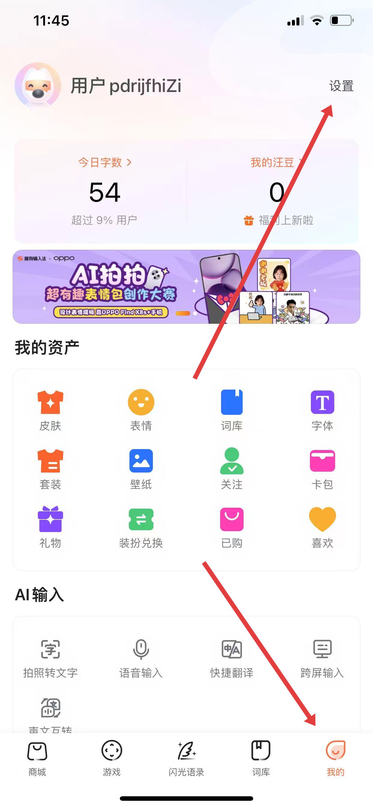 1、打開(kāi)搜狗輸入法,點(diǎn)擊底部菜單欄中的我的,進(jìn)入個(gè)人中心頁(yè)面,然后點(diǎn)擊右上角的設(shè)置。