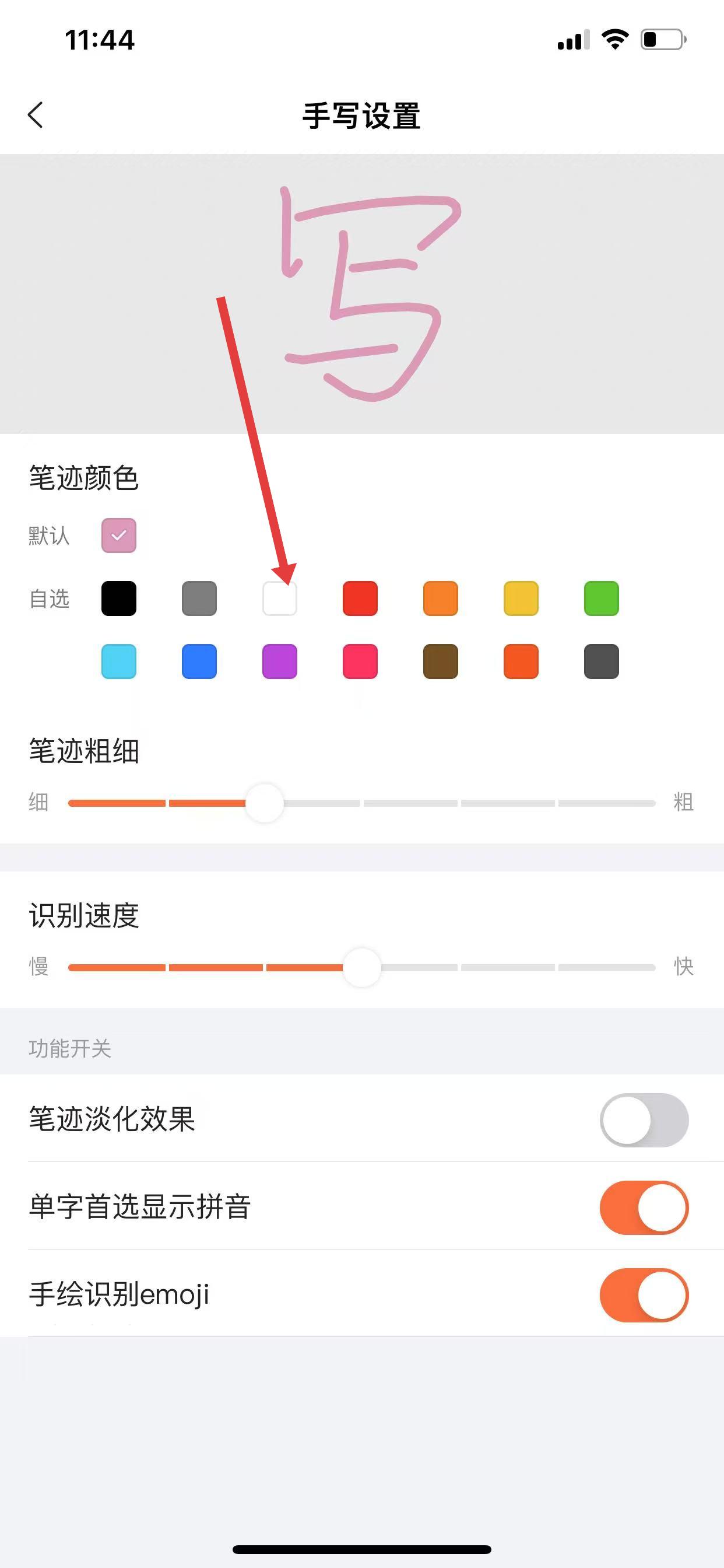 3、在手寫(xiě)設(shè)置界面的筆跡顏色板塊,在自選區(qū)域點(diǎn)擊想要設(shè)置的顏色方塊。