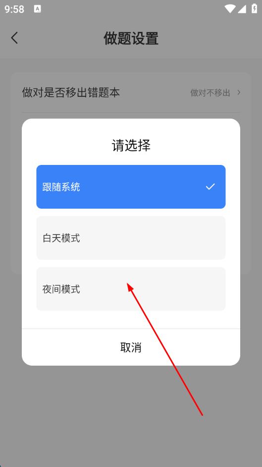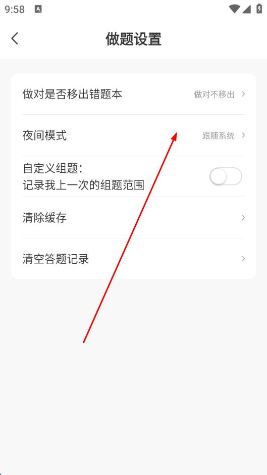4、在做題設(shè)置頁面,點擊夜間模式選項。