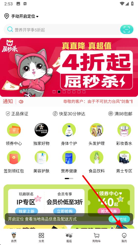 1、打開屈臣氏app進入首頁后,點擊底部導(dǎo)航欄最右側(cè)我的圖標進入個人頁面。