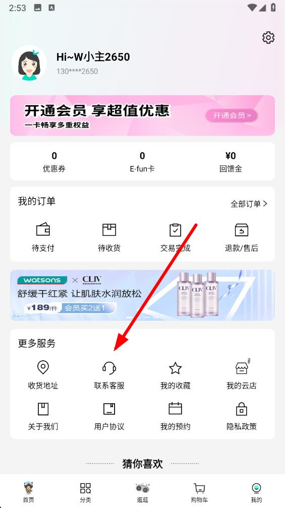 2、在我的頁面中找到更多服務(wù)板塊,點擊其中的聯(lián)系客服選項進入在線客服界面。