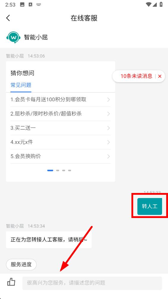 3、在線客服界面,點擊底部編輯文字轉(zhuǎn)人工,點擊發(fā)送后待轉(zhuǎn)接成功,在輸入框描述問題即可。