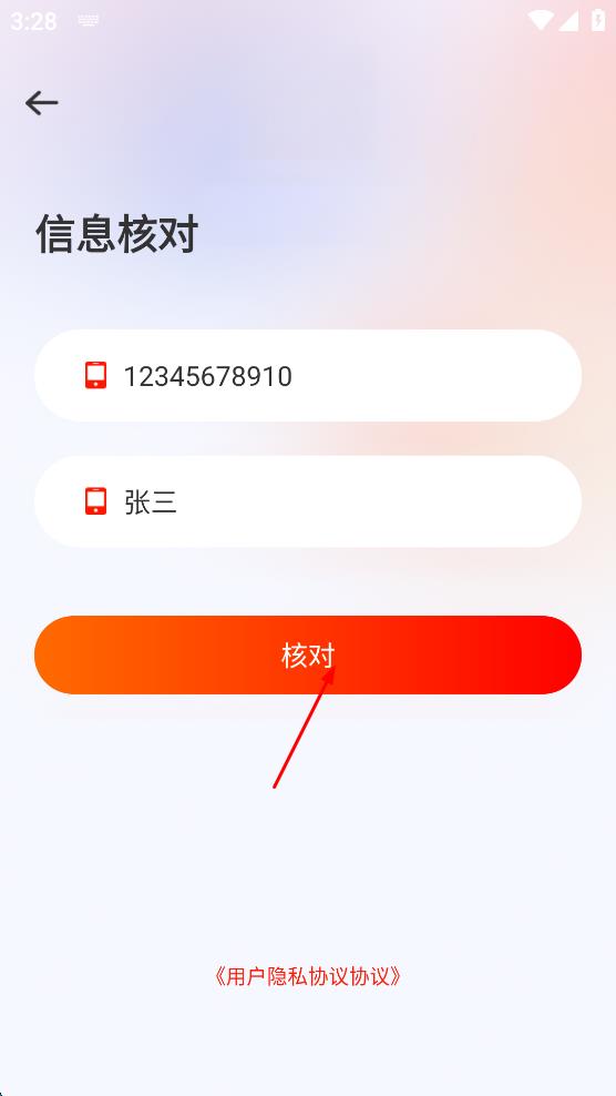 4、輸入完成后,點(diǎn)擊下方的“核對(duì)”按鈕,完成信息核對(duì),后續(xù)按提示完成注冊(cè)登錄流程即可。