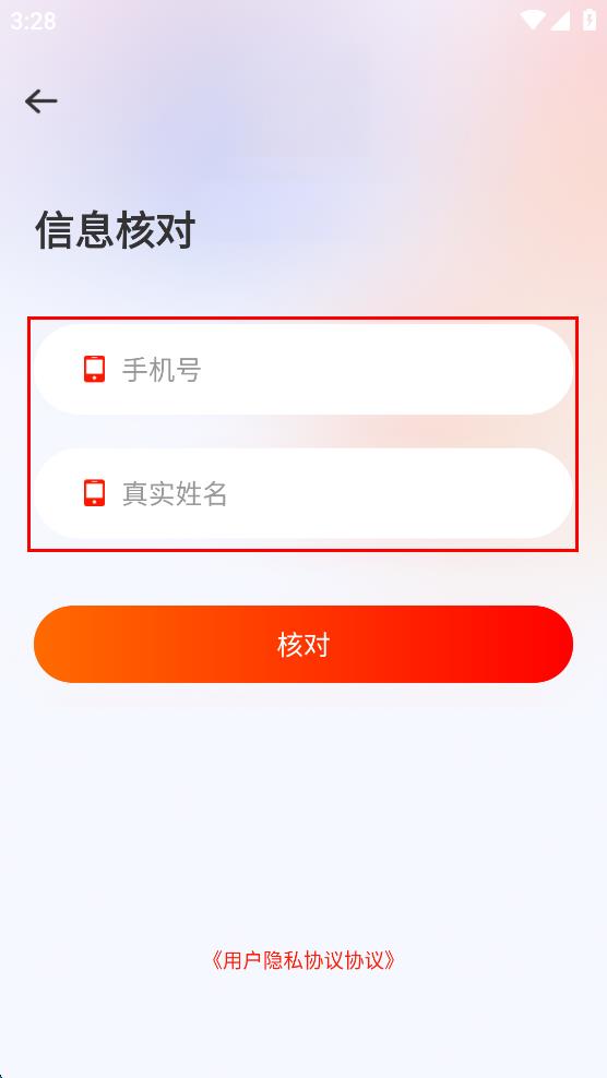 3、在信息核對(duì)頁(yè)面,分別在“手機(jī)號(hào)”和“真實(shí)姓名”欄中輸入自己的手機(jī)號(hào)和真實(shí)姓名。