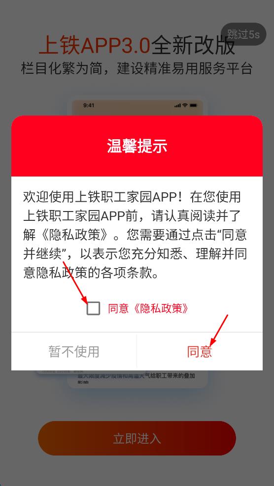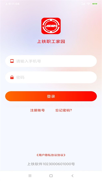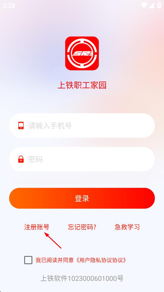 1、打開(kāi)上鐵職工家園APP,在彈出的“溫馨提示”框中,勾選同意隱私政策,然后點(diǎn)擊“同意”按鈕,進(jìn)入登錄頁(yè)面。