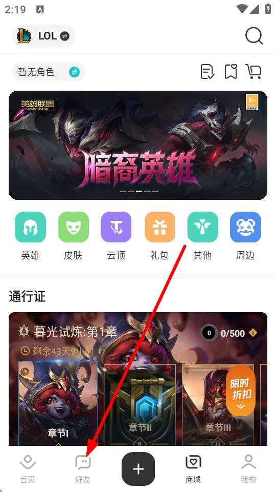 1、打開掌上英雄聯(lián)盟APP,點(diǎn)擊底部導(dǎo)航欄中的好友選項(xiàng)。