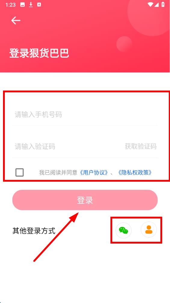 3、進(jìn)入登錄界面后,在對應(yīng)輸入框內(nèi)填寫手機號碼和驗證碼后勾選同意用戶協(xié)議,點擊登錄按鈕即可完成注冊登錄操作,還可以使用第三方直接注冊登錄。