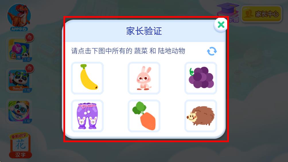 2、點擊家長中心后,會彈出家長驗證窗口,按要求點擊圖中所有的蔬菜和陸地動物完成驗證。