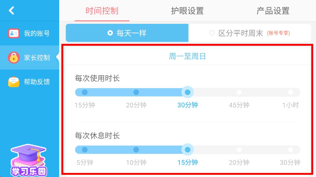 4、在家長控制頁面中選擇時間控制板塊,通過滑動每次使用時長和每次休息時長對應(yīng)的滑塊來設(shè)置使用和休息時間限制。
