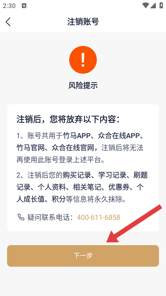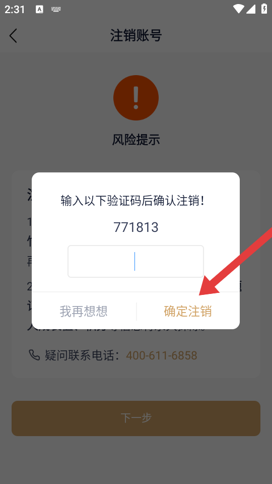 3、在注銷賬號風(fēng)險提示頁面點擊下一步,進(jìn)入驗證碼輸入環(huán)節(jié)。