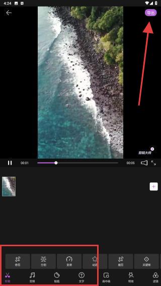 3、進(jìn)入編輯頁后,底部工具欄找到合適的工具進(jìn)行剪輯,剪輯后點(diǎn)擊導(dǎo)出即可。