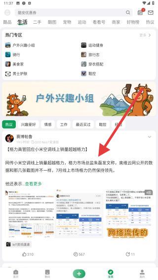 3、圈子參與:進(jìn)入發(fā)現(xiàn)→圈子,加入興趣圈如戶外、搞機(jī),參與話題討論如圖中戶外興趣小組的動(dòng)態(tài)互動(dòng),支持@成員、投票互動(dòng)。