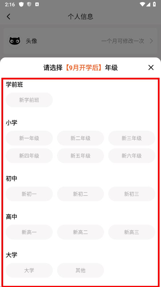 4、在彈出的年級選擇界面中,根據(jù)實(shí)際情況選擇對應(yīng)的年級選項(xiàng),即可完成年級修改。