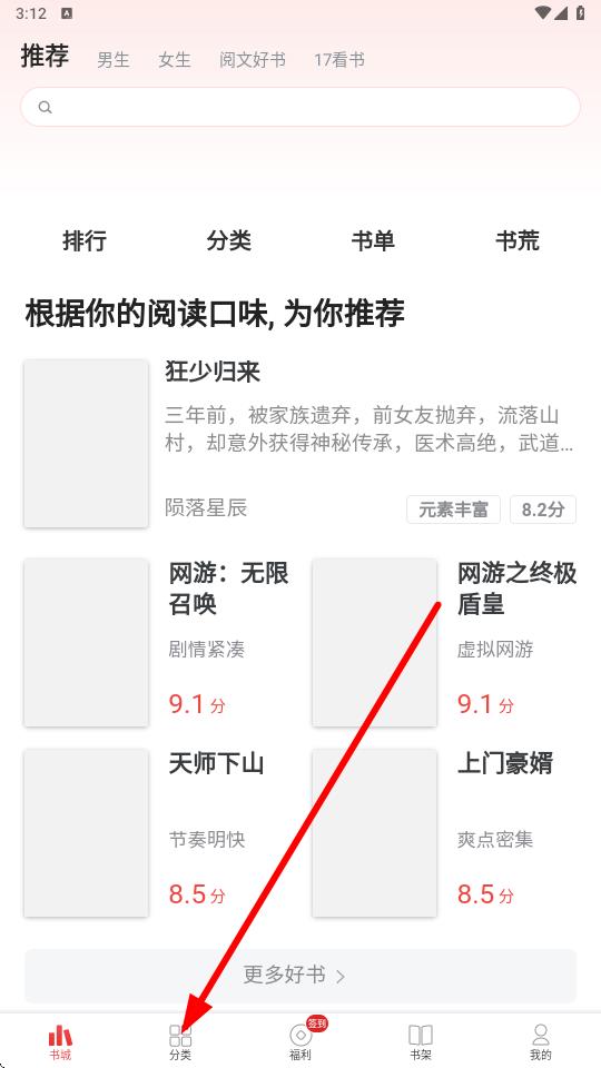1、打開追書神器進(jìn)入書城頁面,點(diǎn)擊底部導(dǎo)航欄中的分類選項(xiàng)。