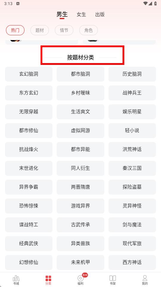 2、在分類頁面中,點(diǎn)擊按題材分類欄,此時(shí)會(huì)展示眾多題材選項(xiàng)。