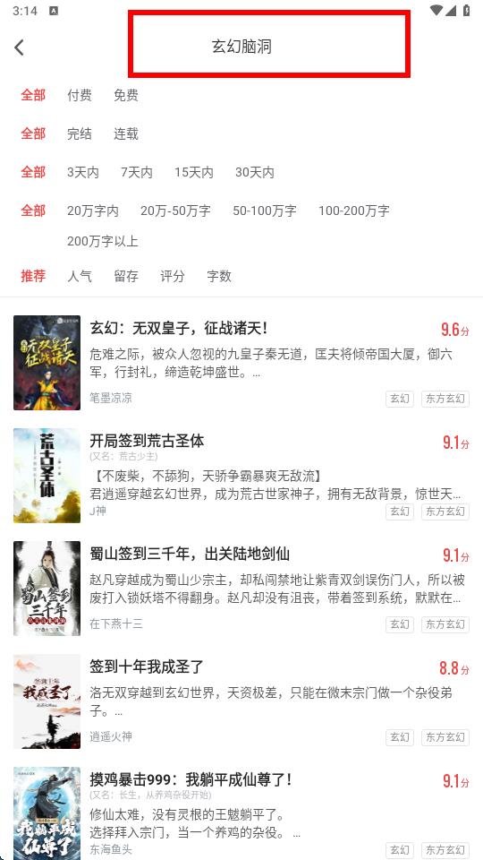3、點(diǎn)擊感興趣的題材,比如玄幻腦洞,進(jìn)入該題材頁面后,即可瀏覽該題材下的各類書籍。