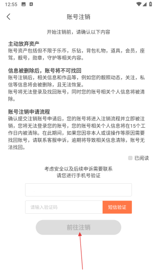 4、按照頁面提示,完成手機(jī)號驗(yàn)證,然后點(diǎn)擊前往注銷,即可提交賬號注銷申請。