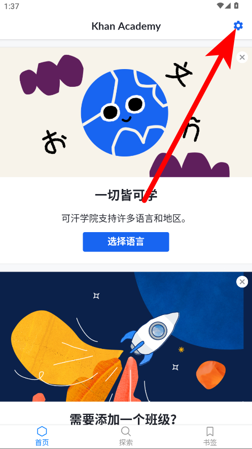 1、在可汗學(xué)院首頁,點(diǎn)擊右上角設(shè)置圖標(biāo),進(jìn)入設(shè)置頁面。
