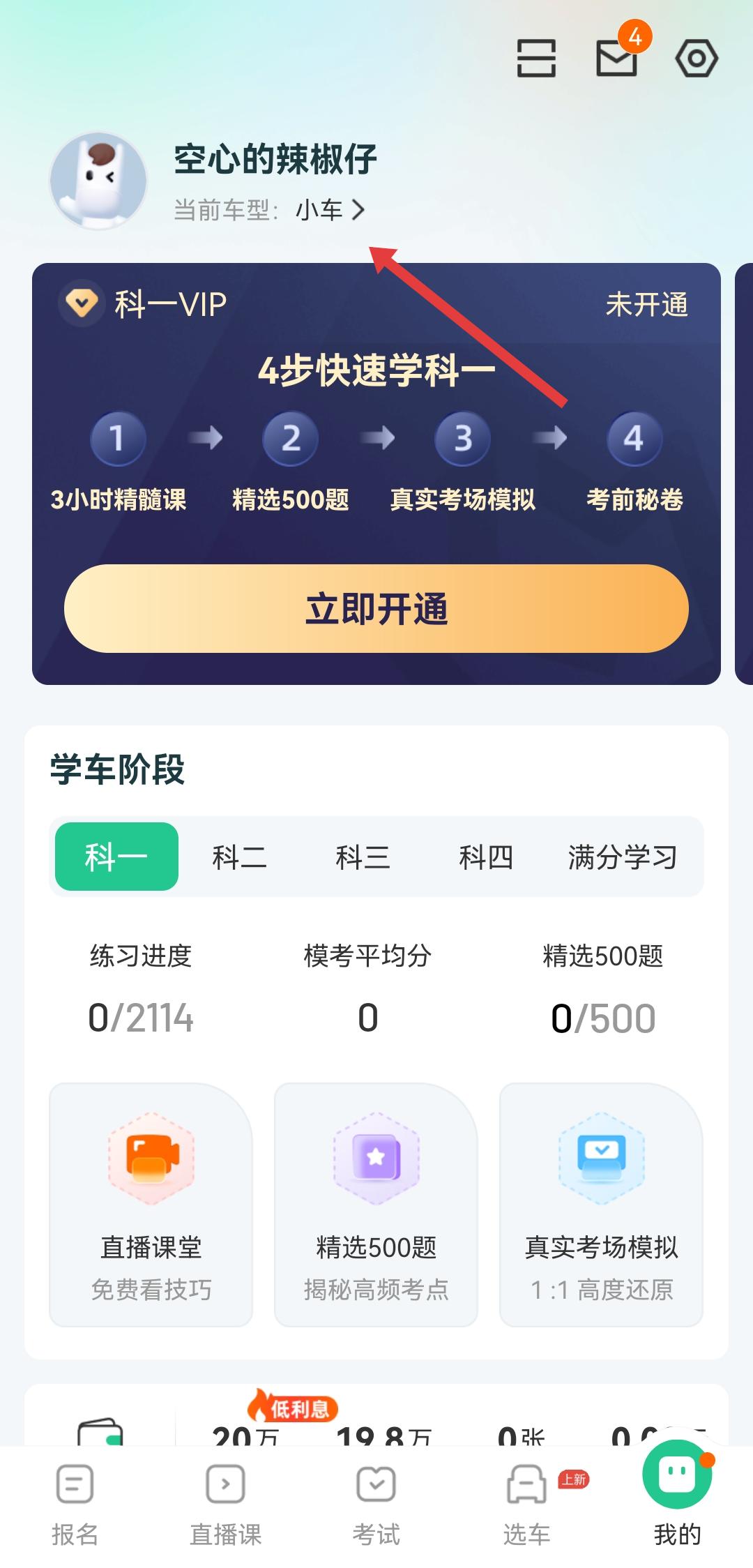 2、在我的頁面中,找到當前車型區(qū)域如顯示當前車型小車,點擊進入駕照類型選擇界面。