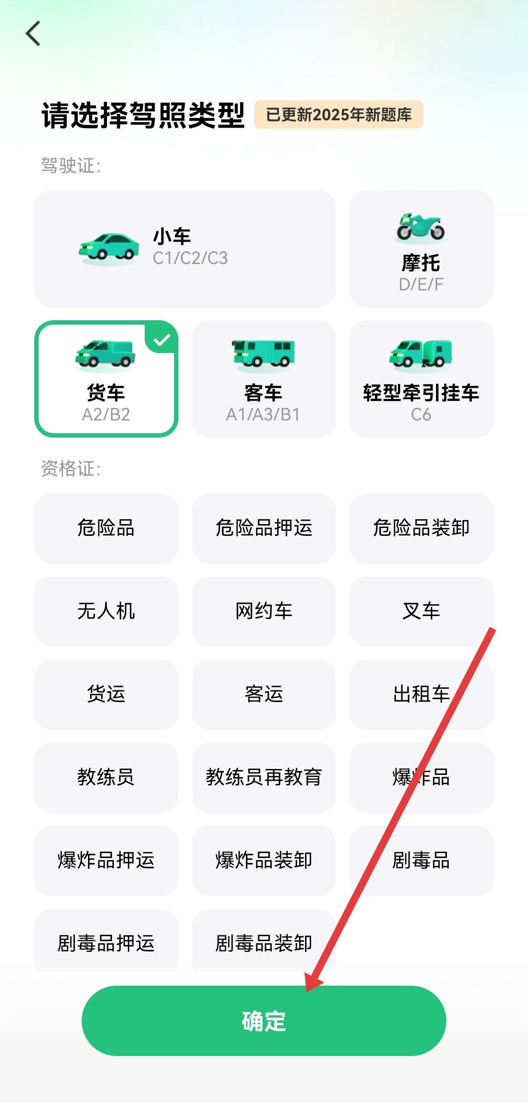 3、在請選擇駕照類型頁面,選擇目標車型,點擊底部的確定按鈕。