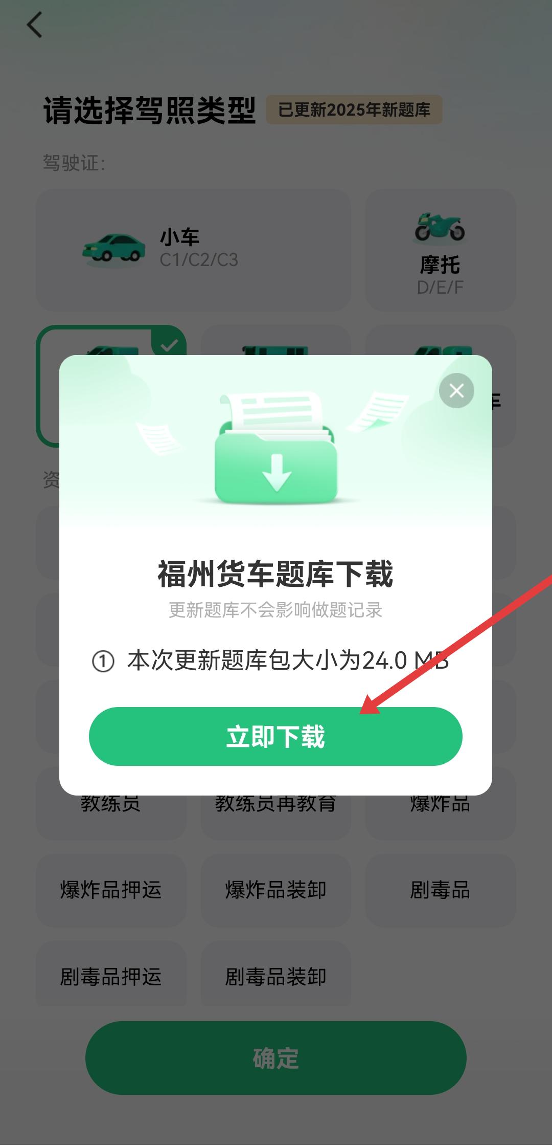 4、系統(tǒng)彈出對應(yīng)車型的題庫下載提示,點擊立即下載,完成車型切換及題庫更新。