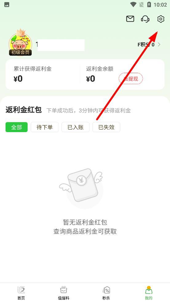 1、打開(kāi)返利網(wǎng)app點(diǎn)擊底部導(dǎo)航欄中的我的選項(xiàng),進(jìn)入個(gè)人頁(yè)面,在頁(yè)面右上角找到設(shè)置圖標(biāo)進(jìn)入設(shè)置界面。