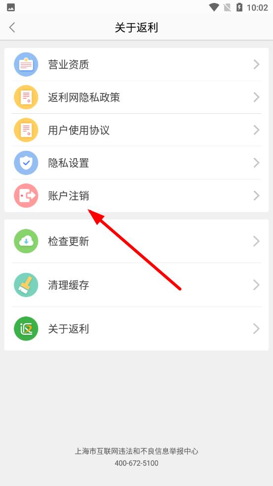 3、在關(guān)于返利頁(yè)面里,點(diǎn)擊賬戶(hù)注銷(xiāo)選項(xiàng),按照頁(yè)面提示的流程進(jìn)行操作,完成后即可注銷(xiāo)返利網(wǎng)賬號(hào)。