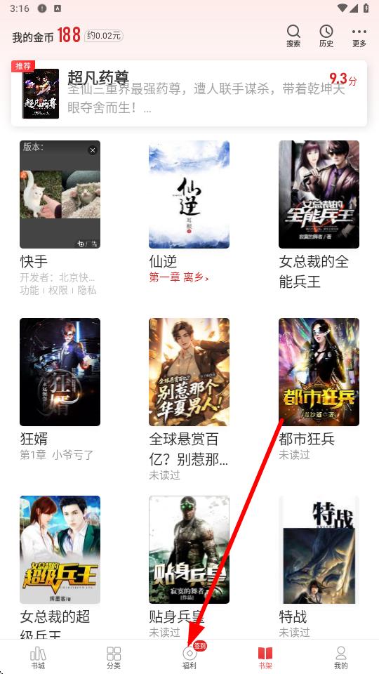1、打開(kāi)追書(shū)神器,點(diǎn)擊底部導(dǎo)航欄中的福利選項(xiàng)。
