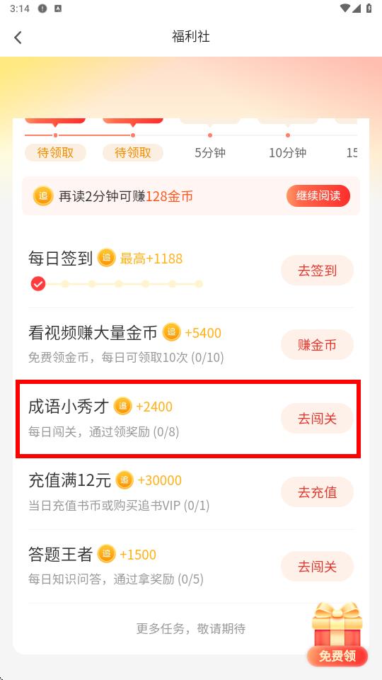 2、在福利社頁(yè)面,找到成語(yǔ)小秀才板塊,點(diǎn)擊右側(cè)的去闖關(guān)按鈕。