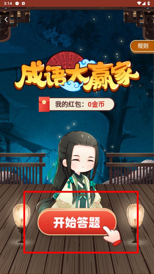 3、進(jìn)入成語(yǔ)大贏家游戲界面后,點(diǎn)擊開(kāi)始答題,即可參與成語(yǔ)答題游戲。