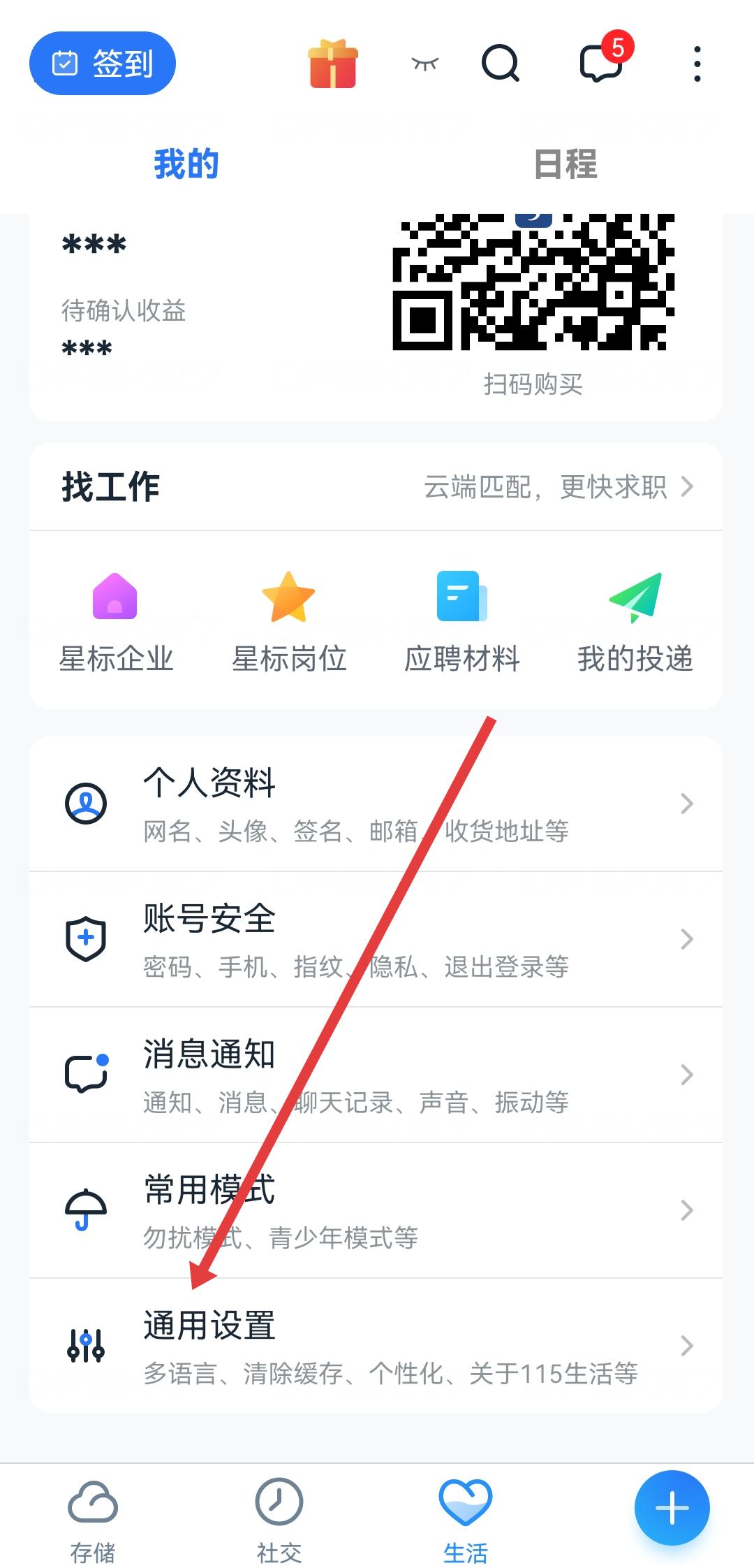 1、打開115生活A(yù)PP,進(jìn)入我的頁面,點(diǎn)擊通用設(shè)置選項(xiàng),進(jìn)入通用設(shè)置界面。