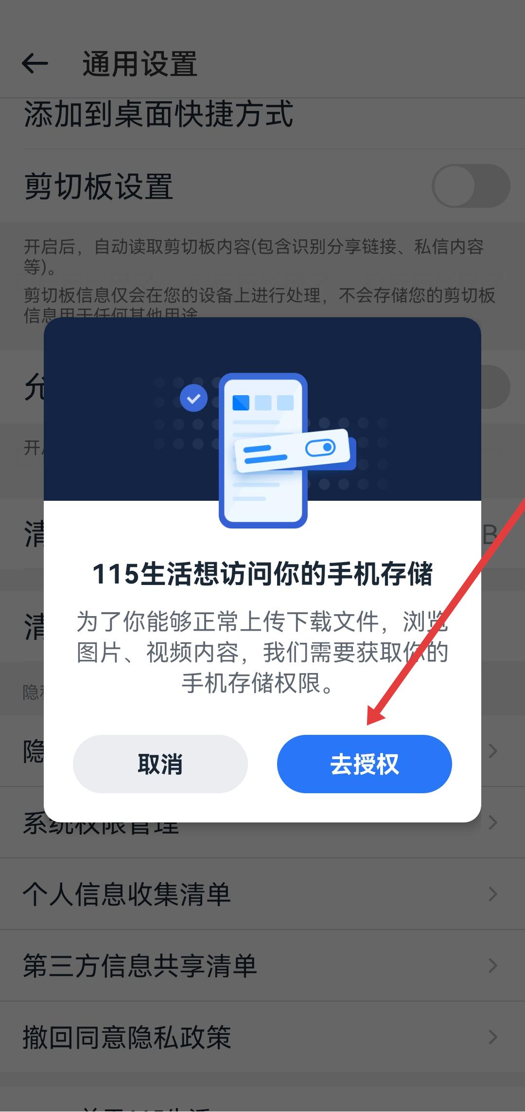 3、在115生活想訪問你的手機(jī)存儲(chǔ)彈窗中,點(diǎn)擊去授權(quán)按鈕,為APP開啟存儲(chǔ)訪問權(quán)限。