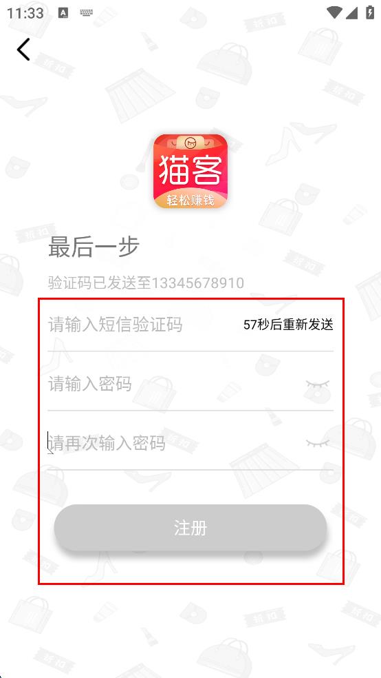 4、進(jìn)入最后一步頁面,輸入短信驗證碼、密碼并再次輸入密碼,然后點(diǎn)擊“注冊”按鈕。
