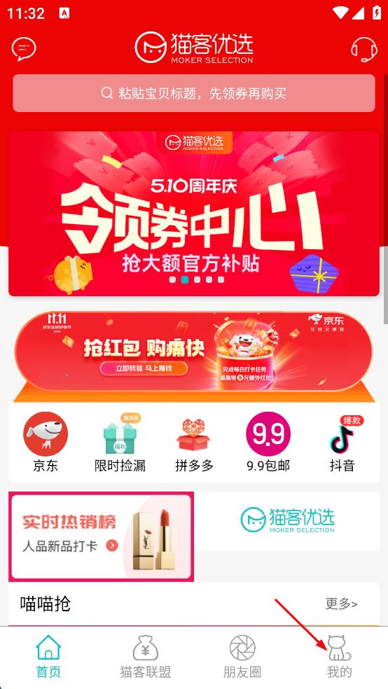 1、打開貓客優(yōu)選APP,進(jìn)入首頁后,點(diǎn)擊頁面右下角的“我的”按鈕。