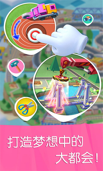 城市建設(shè)任務(wù)多,操作挖掘機(jī)、起重機(jī)、割草機(jī)等13款工程車,鋪管道、搭鋼筋、砌圍墻、刷油漆......創(chuàng)建6大主題建筑,體育館、商業(yè)區(qū)、居民區(qū)、公園、鐵路、橋梁。(認(rèn)識(shí)工程車,鍛煉兒童手眼協(xié)調(diào)能力)