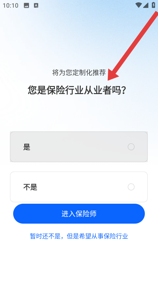 1、在身份選擇頁(yè),按需選擇是或不是保險(xiǎn)行業(yè)的從業(yè)者,點(diǎn)擊進(jìn)入保險(xiǎn)師,開(kāi)啟定制化服務(wù)。